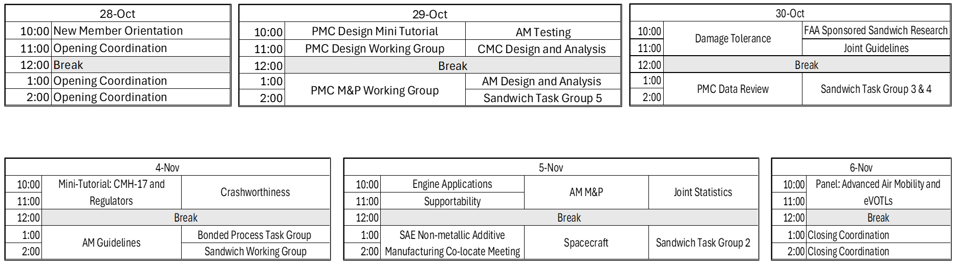 All WG/TG meetings are open to all CMH-17 meeting attendees unless otherwise noted.